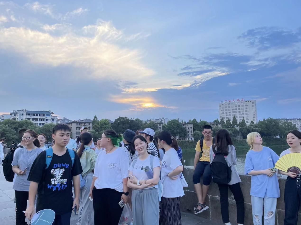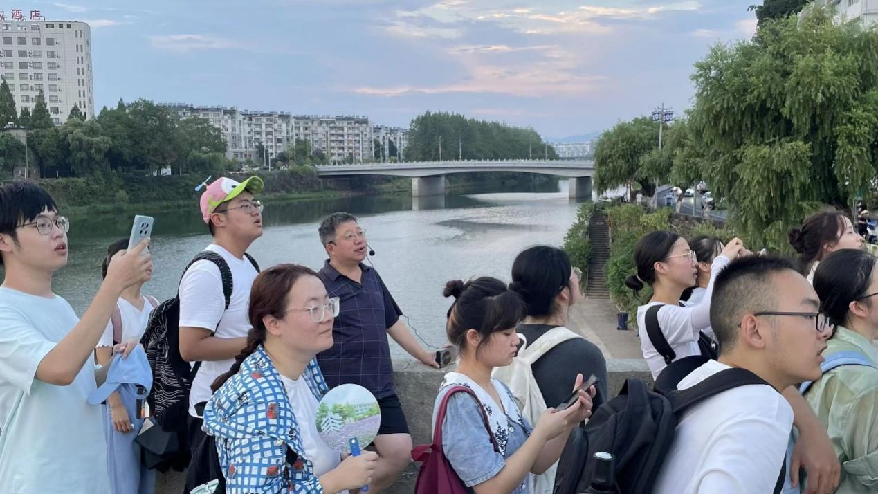 傍晚时分,同学们在孔老师的带领下来到修复后的镇海桥。夕阳西下,一边是宽广微澜的江水,一边是给云彩晕上粉红的夕阳,同学们听着孔老师的讲解,对屯溪既是山城、又是水城的生成机理有了具身的体会,也对城市各个地块渐次走向发展和繁荣的原因有了新的认识。从黎阳到屯溪,再从屯溪到黎阳,历史仿佛一个循环,见证了屯溪因水而兴,也见证了城市规模的不断扩张。