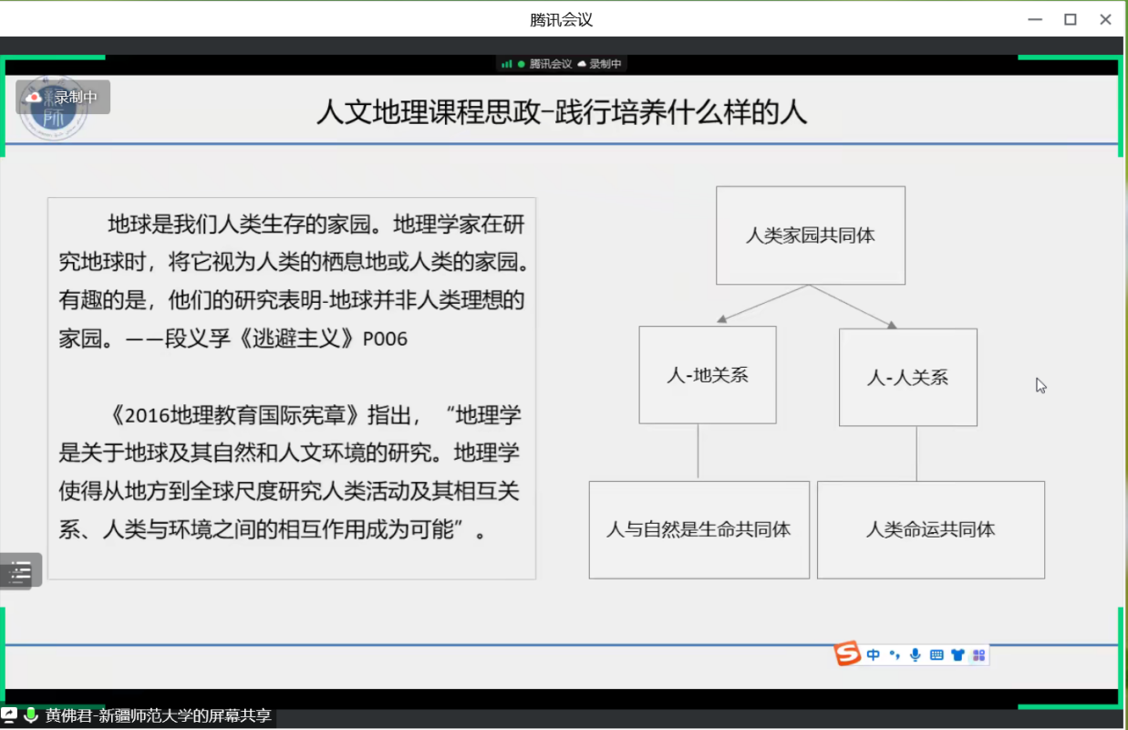 重点分享环节,新疆师范大学教学团队的代表黄佛君老师做了“人文地理学课程思政建设与乡土素材挖掘的探讨”的主题分享。黄佛君老师结合习近平总书记提出的命运共同体理念,提出了人文地理学人类家园共同体研究下的人类命运共同体和人与自然生命共同体相契合的总体思政设计理念和思路;在实践中应用地方感理论的思想开发乡土素材开发、挖掘思政元素,应用案例教学法如何通过解读家乡人文景观中的地标、人地关系、人口迁移,增进学生对家乡的认知和情感、对人类家园的深度关注,进而自下而上地激发学生的家国情怀、增强国家认同,践行课程思政。