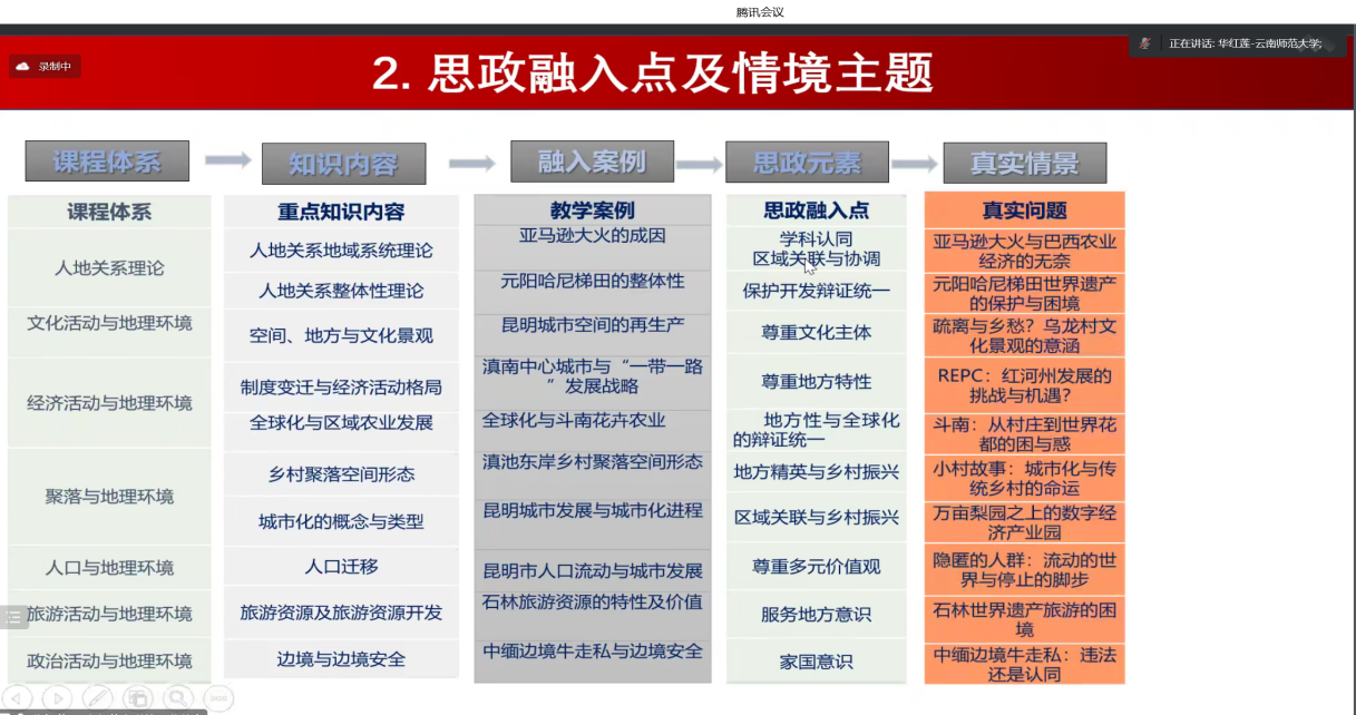 云南师范大学教学团队的代表华红莲老师以“人文地理学课程思政的路径与设计”为主题,分享了教学团队在推进教育部课程思政示范项目建设中取得的阶段性成果。将课程思政目标与学校定位和专业培养目标紧密衔接,基于人文地理学学科特性构建了包含“家国情怀、学科素养、理想人格、价值判断和道德关怀”5个维度18个指标的课程思政体系,并将其渐进融入于“课堂教学-课程实习-区域综合实习”三个课程链条,促进课程思政教学从“个体经验层面”向“理论规范层面”提升。重点交流了在课程实习、综合区域实习以及第二课堂中构建真实情景的思政融入方式和具体实践,以及思政效果测度的积极尝试。