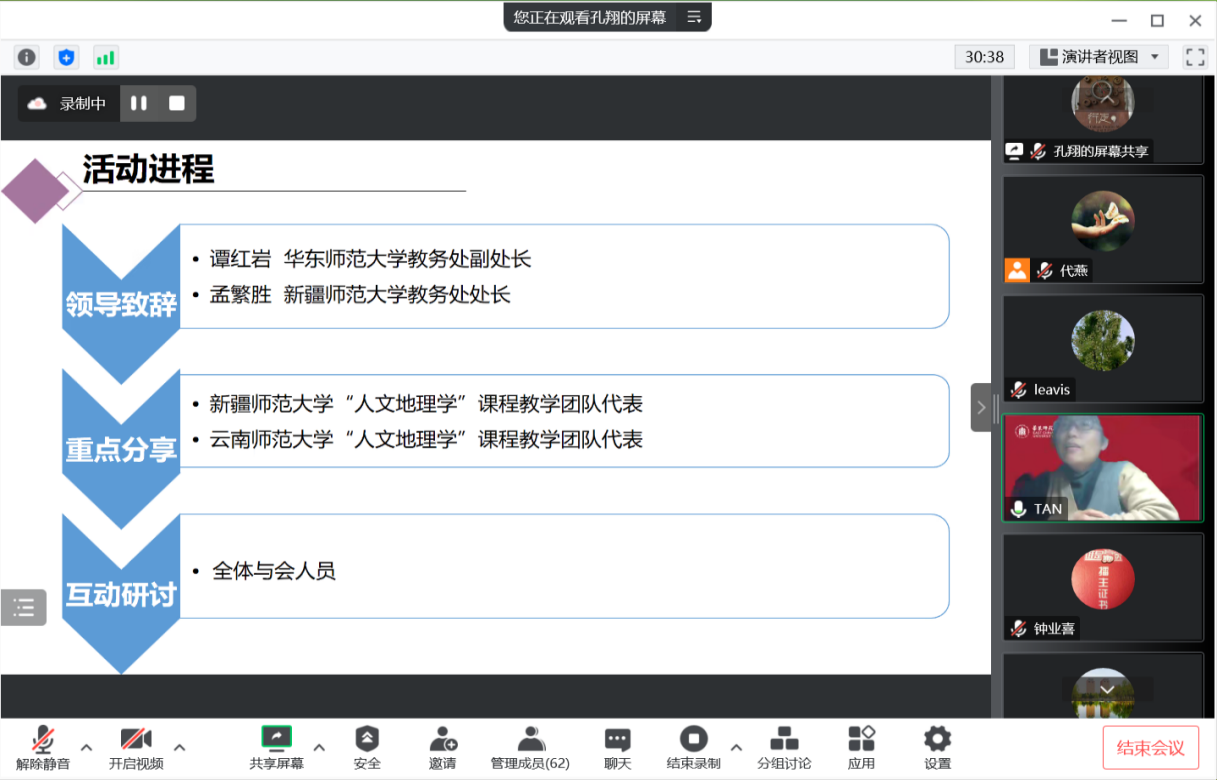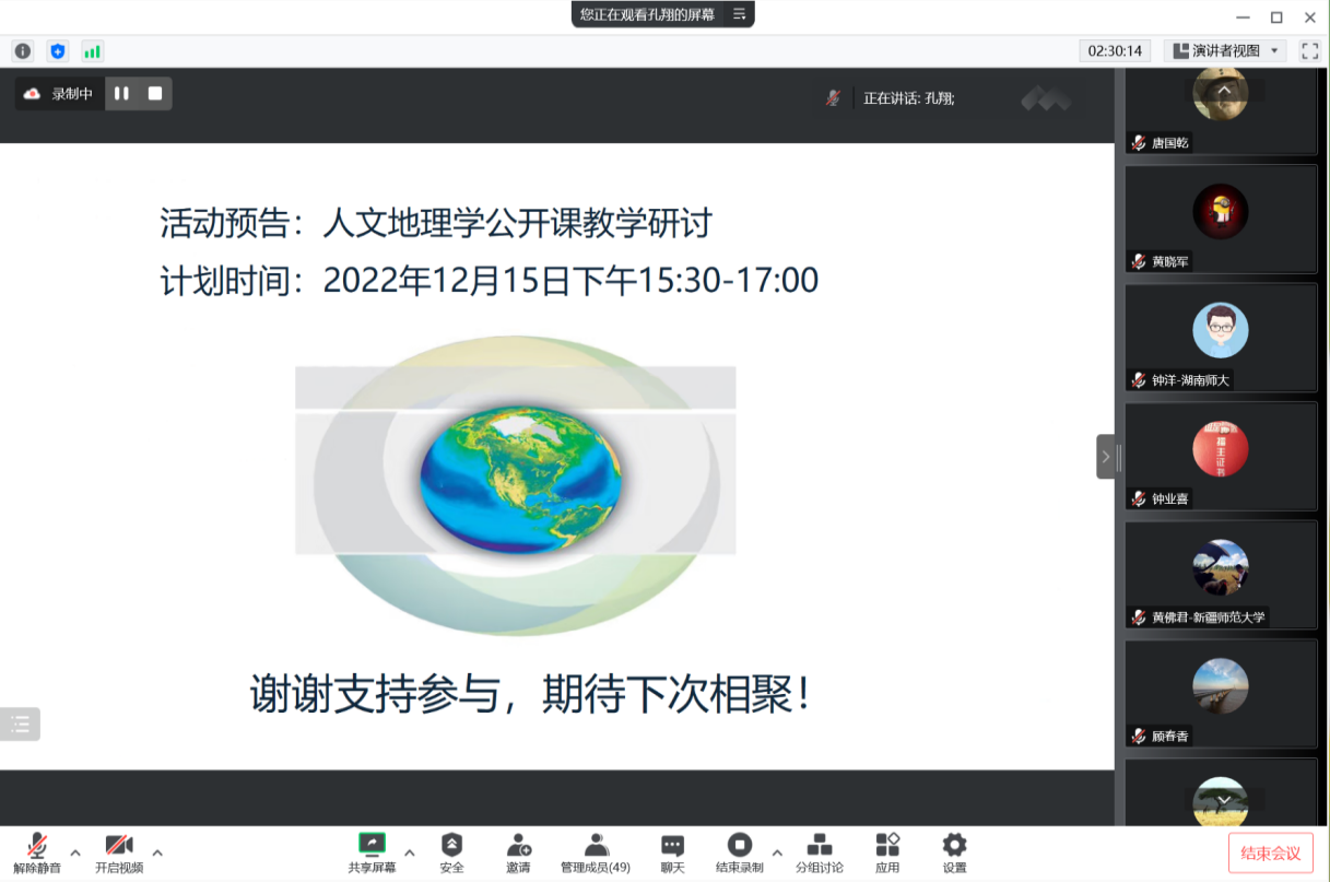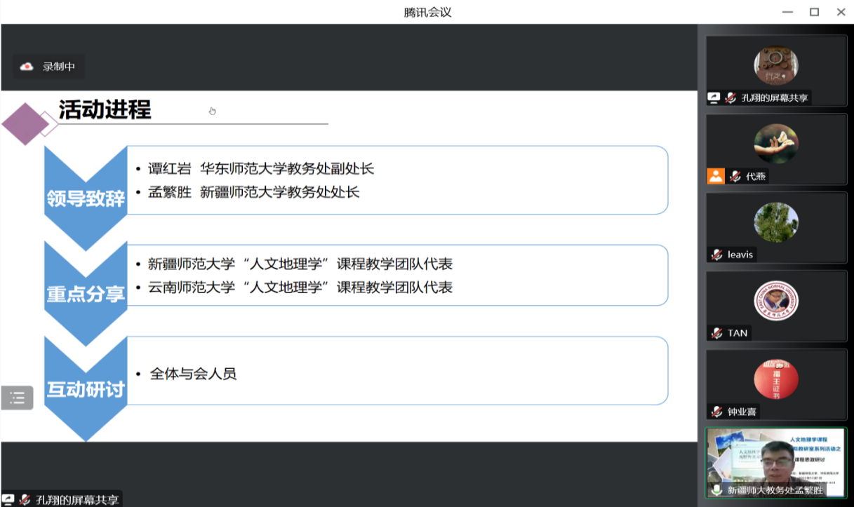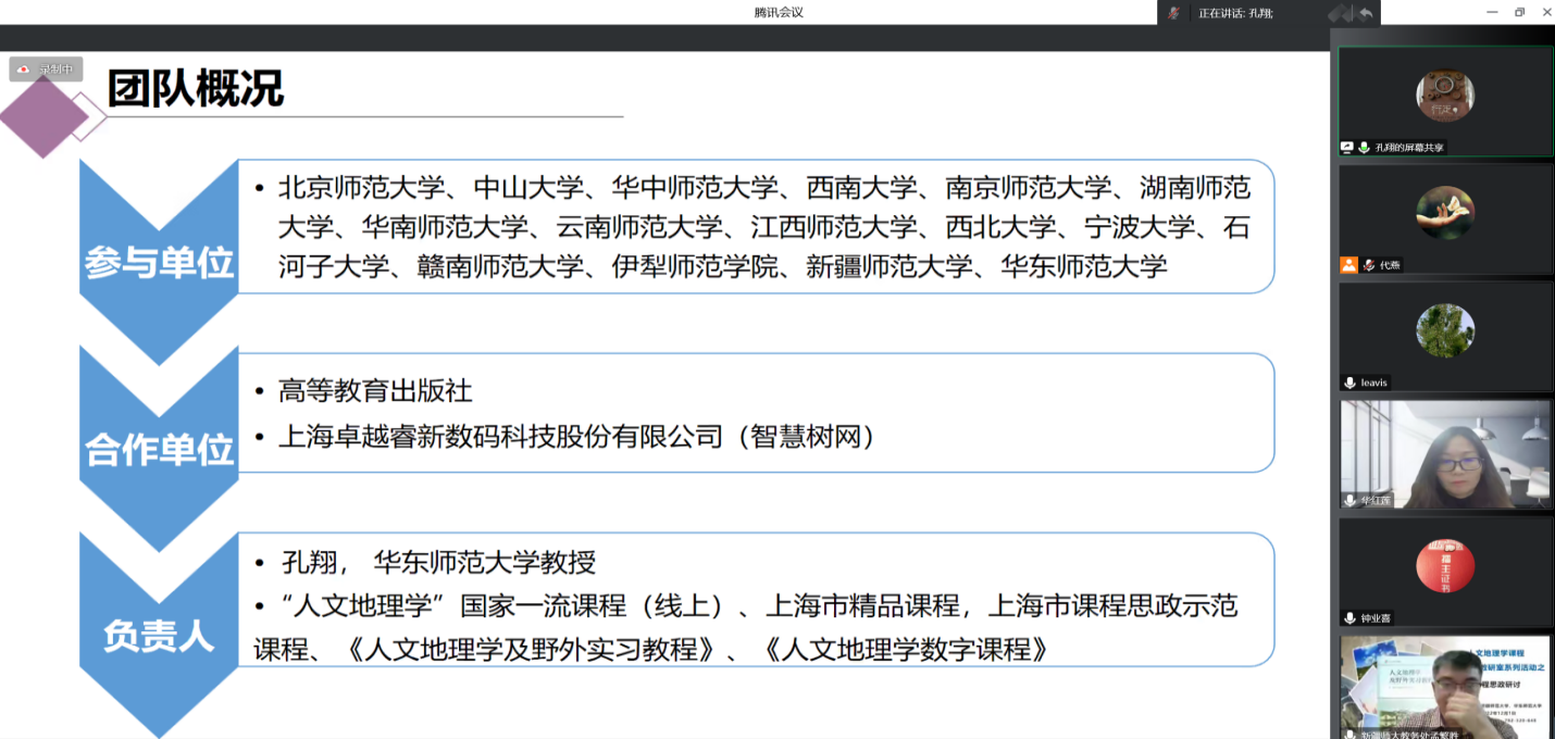 为促进提升人文地理学课程思政建设质量,更好地发挥人文地理学课程的育人优势,人文地理学课程跨校虚拟教研室于2022年12月1日18:00在腾讯会议组织了课程思政与人文地理学课程建设研讨活动,北京师范大学、中山大学、华中师范大学、南京师范大学、湖南师范大学、华南师范大学、云南师范大学、江西师范大学、宁波大学、西北大学、西南大学、伊犁师范大学、喀什大学、新疆师范大学、华东师范大学等近70位从事人文地理学课程教学的老师参加。华东师范大学教务处谭红岩副处长、新疆师范大学教务处孟繁胜处长、高等教育出版社和上海卓越睿新数码科技股份有限公司(智慧树网)的代表应邀参会。
