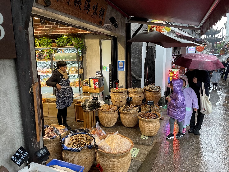在烟雨蒙蒙的水乡里,老师们、孩子们或撑伞,或被雨衣,漫步在水陆并行的石板路上。烟雨长廊内粽子飘香,炊烟袅袅,和着吴侬软语的叫卖声,婉转而悠扬。在枫泾三桥,鱼鹰伸着长长的脖子窥探着群群游客,摆渡的乌篷船摇摇晃晃。在这蒙蒙细雨笼罩的初冬正午,桥上的游客在看风景,看风景的我们正在看他们。