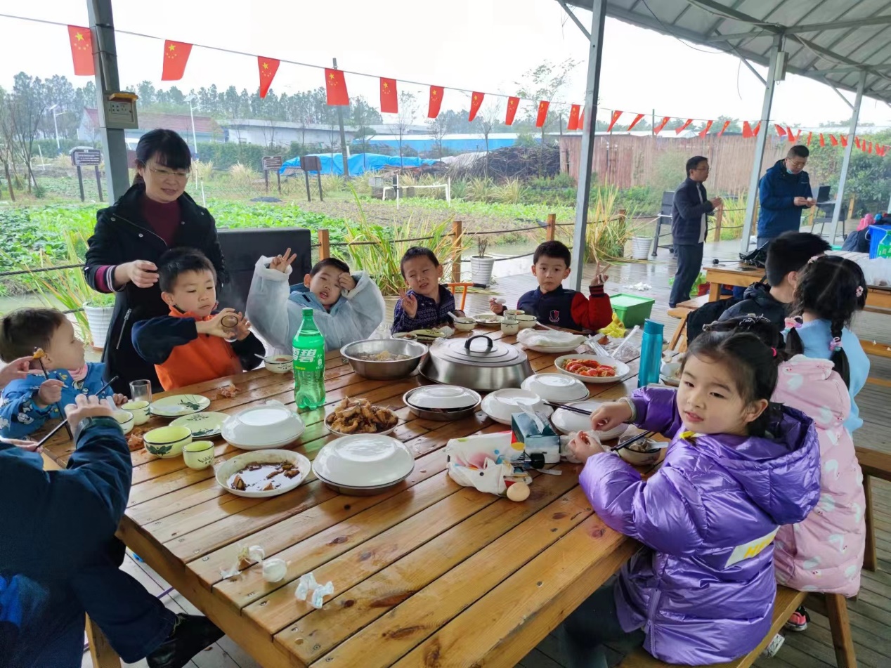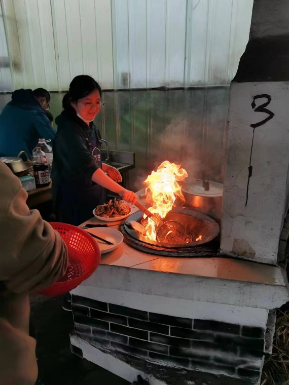经过一夜的休整,第二天上午团队继续前往廊下农场。孩子们四散而去,摸鱼的摸鱼、抓鸡的抓鸡。大人们则点起柴火,为自煮中饭张罗了起来。斧钺钩叉、煎炒烹炸,老师们轮番上阵,你追我赶,小小的农场厨房俨然成了美食大赛的比武现场。不多时、热腾腾的饭菜悉数上桌,老师们团坐一起,开始了年终岁末的团圆大餐!