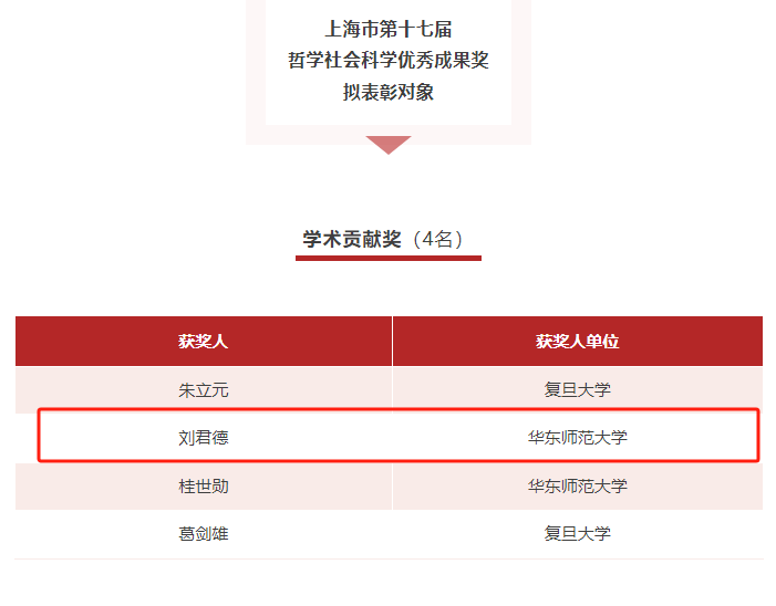 近日,上海市第十七届哲学社会科学优秀成果奖获奖名单正式公布。华东师范大学地理科学学院刘君德教授荣膺“学术贡献奖”。上海市哲学社会科学优秀成果奖是经市委批准设立的本市哲学社会科学最高奖项。学术贡献奖是该奖项体系中的核心奖项之一,主要表彰在哲学社会科学领域作出突出贡献的学者及其成果。自2004年设立来,共有38位知名学者获得该奖项。此次地理学院在学术贡献奖实现新突破,标志着学院在区域发展领域的研究获学界最高认可。此外,刘承良教授的专著《Geography of Technology Transfer in China: A Glocal Network Approach》荣获“学科学术优秀成果奖”二等奖。两位老师获奖彰显了学院在人文与经济地理学领域的深厚学术积淀与创新活力。