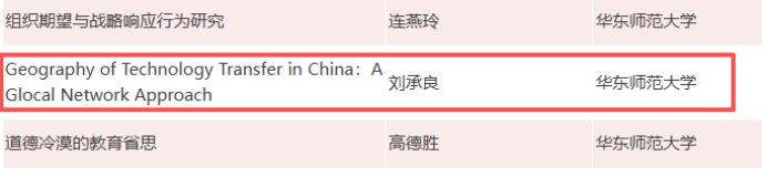 获奖专著《Geography of Technology Transfer in China: A Glocal Network Approach》系统构建了技术转移的“文化-空间-网络”三位一体理论框架,以全球与地方互动视角解析中国技术转移的空间格局与机制,具有重要的理论创新价值。该成果入选华东师范大学英文精品力作系列,获《地理学报》书评高度评价,并被中国城市百人论坛长篇推介。相关论文发表于《Annals of Regional Science》《Papers in Regional Science》《地理学报》《中国软科学》等高影响力期刊,理论观点获《学习时报》、“学习强国”平台及《科技中国》等媒体转载,产生广泛学术与社会影响。