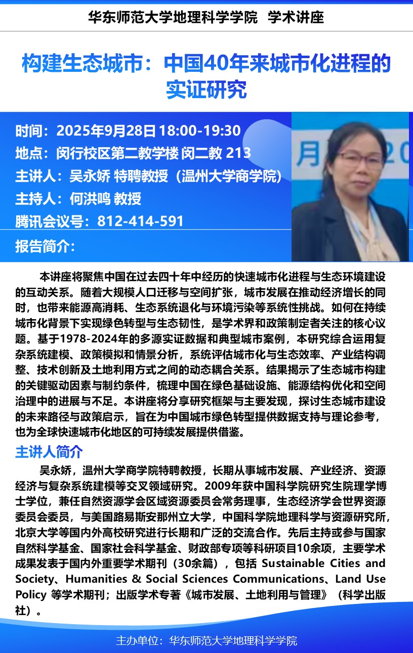 【讲座9-28】构建生态城市:中国40年来城市化进程的实证研究